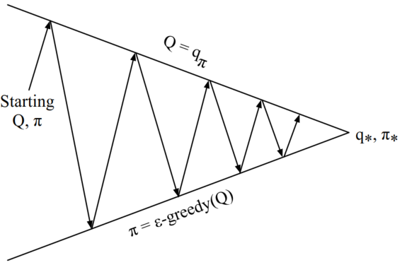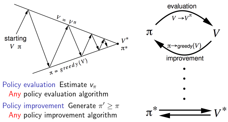 从一个策略\pi和一个状态价值函数V开始,每一次箭头向上表示利用当前策略进行状态价值函数的更新,每一次箭头向下代表着根据更新的状态价值函数贪婪地选择新的策略,说它是贪婪的,是因为每次都采取转移到状态价值函数最高的新状态的动作。最终将收敛至最优策略和最优状态价值函数。