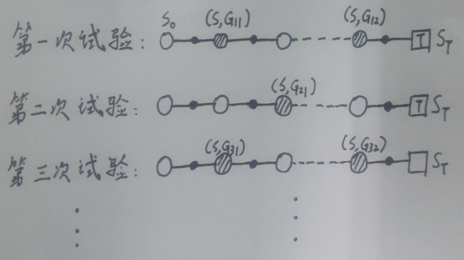 ②、k=k+1,基于策略\pi进行第k次蒙特卡洛采样,得到一个完整的episode(S_T为终止状态):