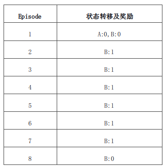 本例子中状态B是终止状态,没有下一个状态,因此,它的状态价值这接用其在8个episode中的回报求平均获得,即V(B)=\frac{6}{8};