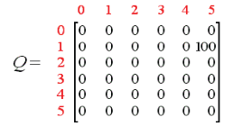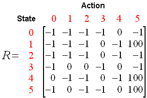 此时,我们可以以状态为行,动作为列,构建一个如下所示的关于reward值的矩阵R,其中-1表示空值,表示相应节点之间没有边相连。