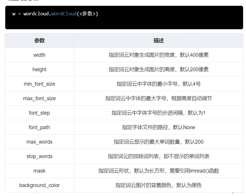 3、wordcloud库:可以根据文本中词语出现的频率等参数绘制词云