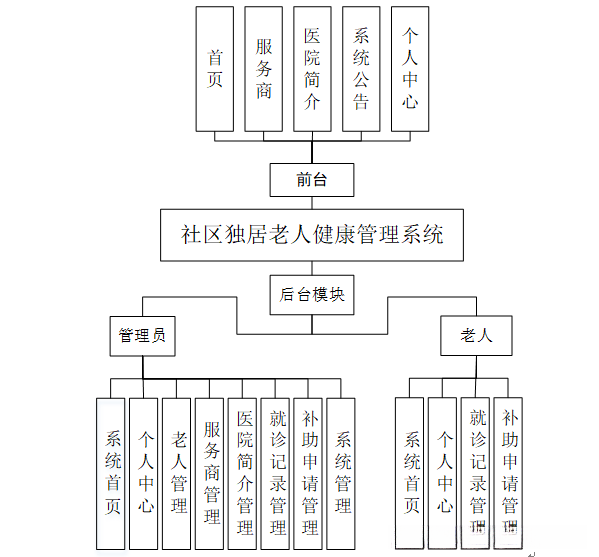 系统分成两个角色,根据每个角色的权限分析得出两大模块,包括管理员模块,和老人模块;管理员模块主要针对整个系统的管理进行设计,提高了管理的效率和标准。系统的总体模块功能设计如下图所示:。