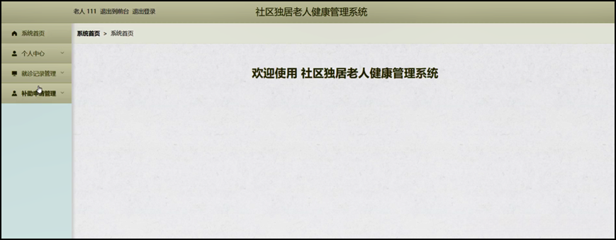 老人进入系统可以对个人中心、就诊记录管理、补助申请管理等功能进行操作。老人主页面如图5-12所示: