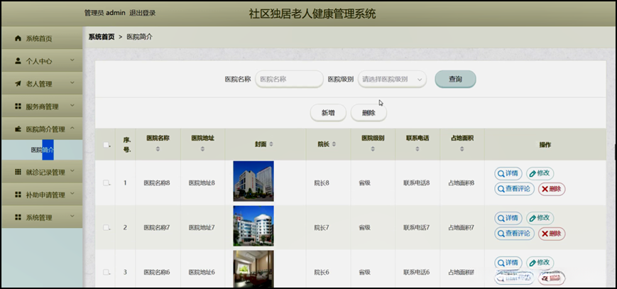 管理员点击医院简介管理。在医院简介页面输入医院名称和选择医院级别进行查询、新增或删除医院简介列表,并根据需要对医院简介详细信息进行详情、修改、查看评论或删除操作。如图5-8所示: