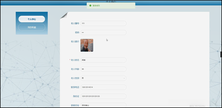 老人模块的主要设计是:在登陆成功后,本系统实现对个人中心、就诊记录管理、补助申请管理等功能进行详细操作;