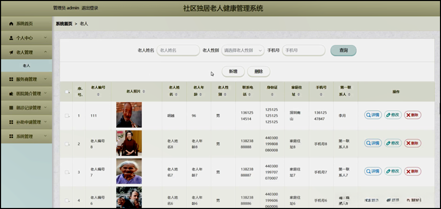 管理员点击老人管理。在老人页面输入老人姓名、手机号和选择老人性别进行查询、新增或删除老人列表,并根据需要对老人详情信息进行详情、修改或删除操作;如图5-6所示: