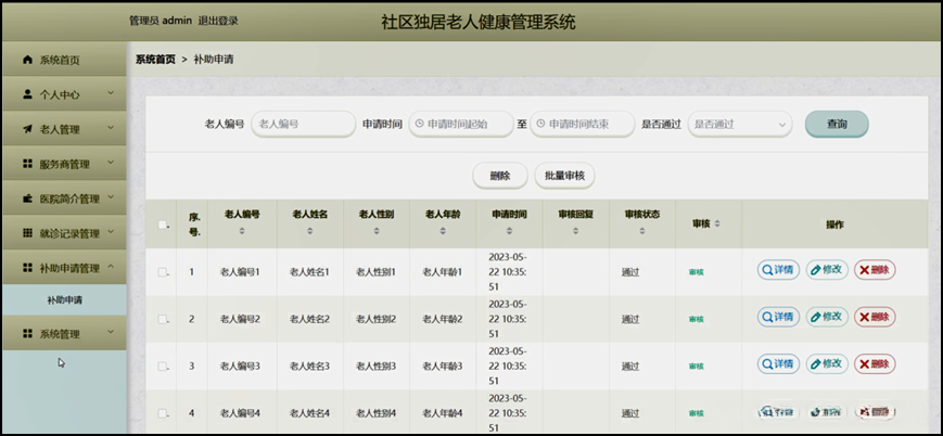 管理员点击补助申请管理。在补助申请页面输入老人编号、申请时间和选择是否通过进行查询、批量审核或删除补助申请列表,并根据需要对补助申请详细信息进行详情、修改或删除操作。如图5-10所示: