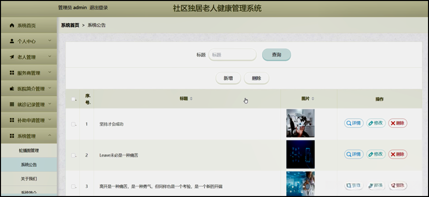 管理员点击系统管理。在系统公告页面输入标题进行查询、新增或删除系统公告列表,并根据需要对系统公告详细信息进行详情、修改或删除操作;还可以对轮播图管理、关于我们和系统简介进行详细操作。如图5-11所示: