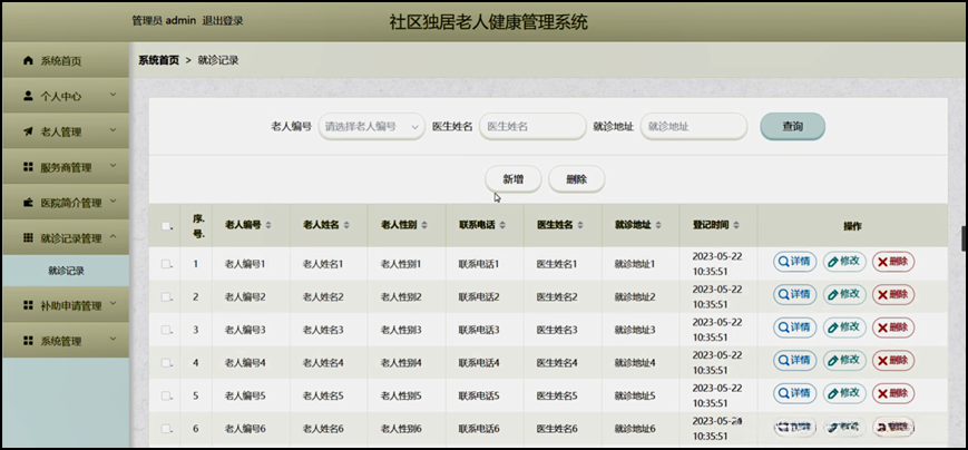 管理员点击就诊记录管理。在就诊记录页面输入医生姓名、就诊地址和选择老人编号进行查询、新增或删除就诊记录列表,并根据需要对就诊记录详细信息进行详情、修改或删除操作。如图5-9所示: