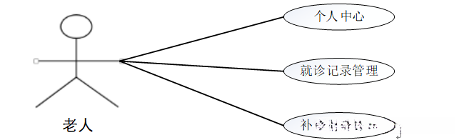 (2)老人可以对个人中心、就诊记录管理、补助申请管理等进行基本的信息管理。老人用例分析如图3-2所示。