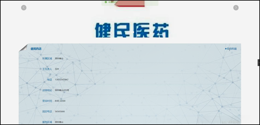 服务商:在服务商页面的输入栏中输入药店名称、所属区域和服务区域进行查询,可以查看到服务商详细信息,并根据需要进行评论或收藏操作;服务商页面如图5-2所示: