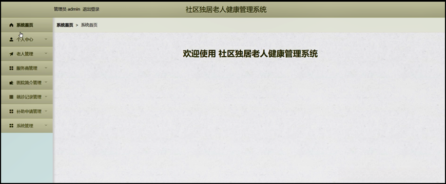 管理员进入主页面,主要功能包括对个人中心、老人管理、服务商管理、医院简介管理、就诊记录管理、补助申请管理、系统管理等进行操作。管理员主页面如图5-5所示: