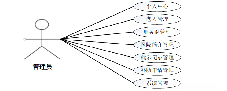 (1)管理员可以对个人中心、老人管理、服务商管理、医院简介管理、就诊记录管理、补助申请管理、系统管理等进行基本的信息管理。其用例分析如图3-1所示。