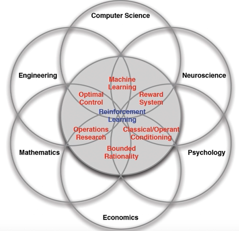 我们来认识一下什么是强化学习。强化学习它不只是计算机科学中的内容,它其实是一个交叉性的综合学科,如图所示,它是计算机科学、工程学、数学、经济学、心理学、神经科学等学科的交叉。