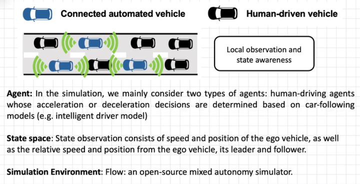 文中把系统抽象为包含两种agent。一种是Automated-vehicle agent,另一种是Human-driven agent。主要观测的状态空间(state space)包含自主控制车辆(ego vehicle)的相对速度和位置,以及来自自主控制车辆领导者(leader)和跟随者(follower)的相对速度和位置。 仿真环境为一个开源的混合自治模拟器。
