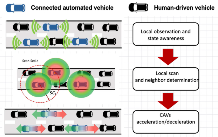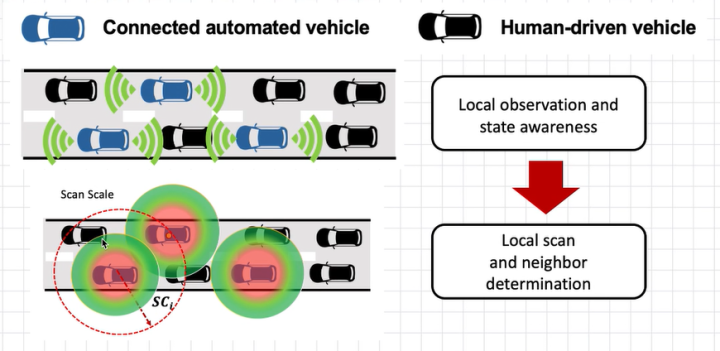 上图论文解决的问题是如何通过多车协同规划提升交通系统的通行效率。多车协同是在仿真系统里同时存在人类专用的车辆和自动驾驶车辆。它与单车智能的只关注去提升自己的通行效率是不太一样的。单车智能是只关注如何让车辆自己去更快的换道,更安全的并线的问题等等。可能在2025年或者是四五年之后,随着自动驾驶车的普及,我们可能至少会有20%的车辆是自动驾驶车辆,那么这时多车协同会帮我们解决网联车的系统如何去协同决策的问题,它的系统也更为复杂。