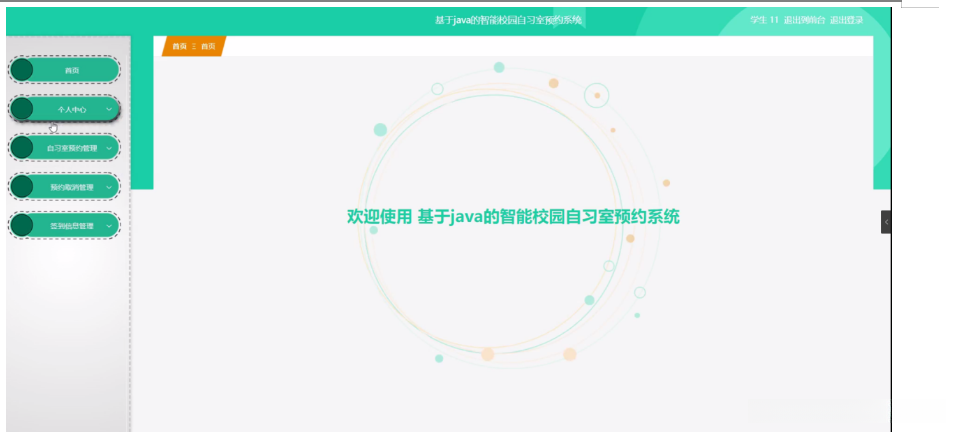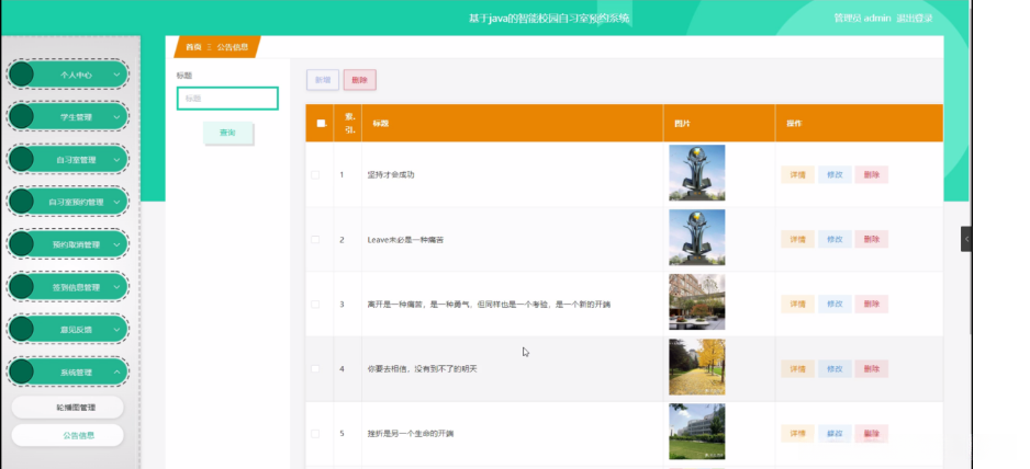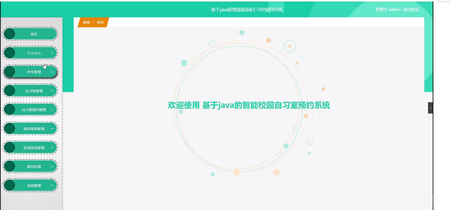 管理员登录主界面后,在线窗体上主要操作功能包含:负责完成首页信息展示、个人中心资料维护以及学生信息管理等各项日常事务;具体包括对首页内容更新(如课程安排)、个人中心数据维护(如个人信息设置)、学生管理(如学籍状态查询)以及自习室及自习预约系统管理等功能的执行。