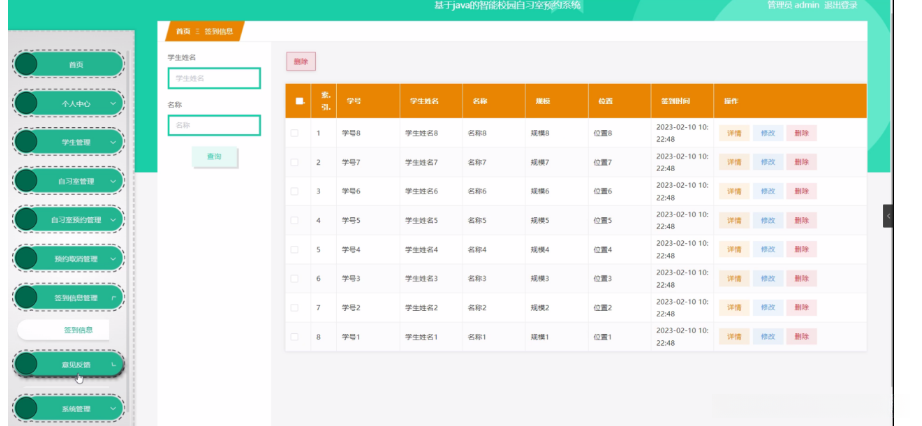 管理员点击执行签到信息管理任务。在签到页面录入学生姓名与学名完成查询与删除操作;根据需求完成详情查看、内容修改以及信息删减;如图5-11所示: