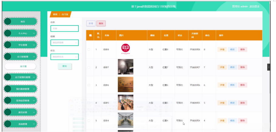 系统管理员单击"自习室管理"按钮后,在打开页面后,在输入栏依次添加名称、规模参数,并根据当前状态设置来执行查询操作。随后可完成信息的查看、更新以及移除等操作,请参考附图中的相关内容。