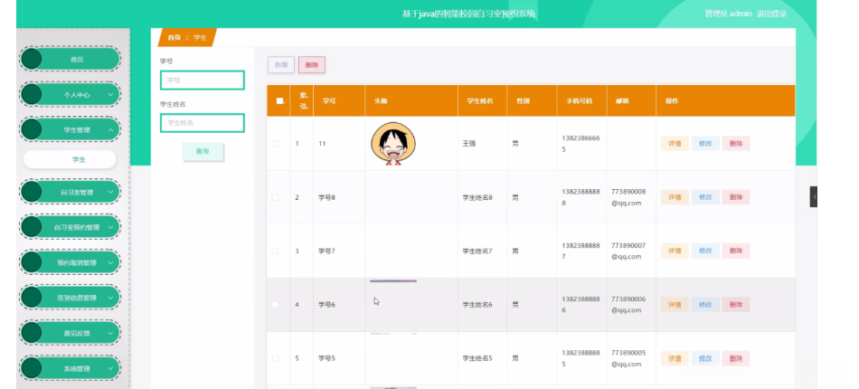 系统管理员点击进入自习室预约管理界面,在该页面字段中输入学生姓名及学号用于查询或删除当前列表,并根据实际需求对相关预约信息执行查看、修改或删除操作。如图5-9所示: