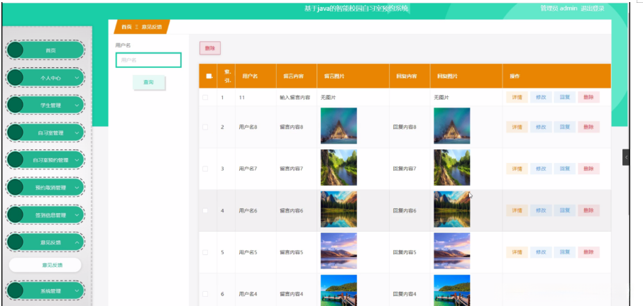 系统管理员对反馈信息的处理流程启动。系统管理员在反馈信息页面中输入用户名以执行查询操作或删除反馈信息列表,并依据具体需求完成对反馈信息详情的查看、修改、回复或删除等操作;如图5-12所示: