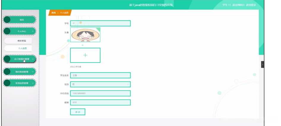 登录系统后,学生能够使用首页、个人中心以及自习室预约相关的功能模块。个人主页如图5-14所示: