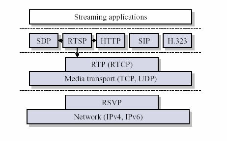 根据图 1所示,在IP层之上、传输层之下运行的一种网络控制协议是Rsvp。基于该协议,在路由器上预留了一定的带宽资源即可确保流媒体传输的服务质量。目前已有多种实际应用实例中都集成使用了该协议作为其核心数据报机制的基础