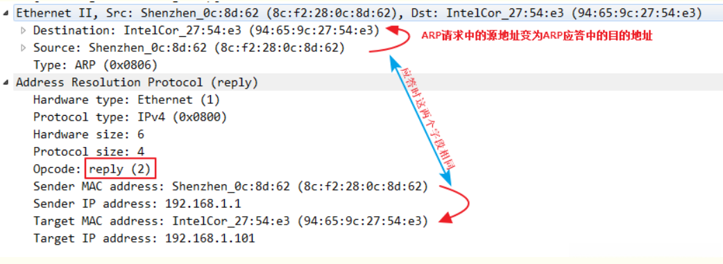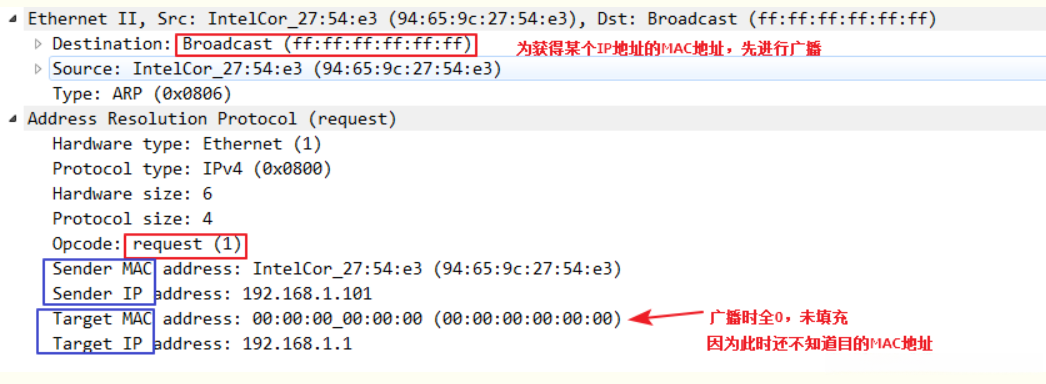 - 以太网目的地址(6Byte):当发送 ARP 请求时此处全为1 (FF:FF:FF:FF:FF:FF),即为广播地址。当发送 ARP 响应时,此处即为目的端 MAC 地址。