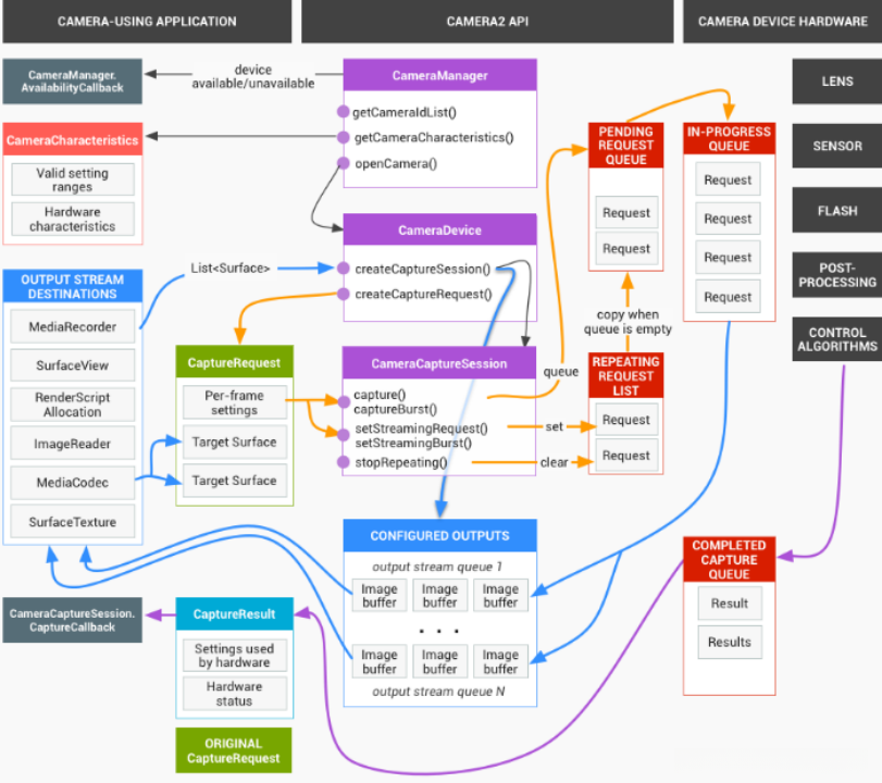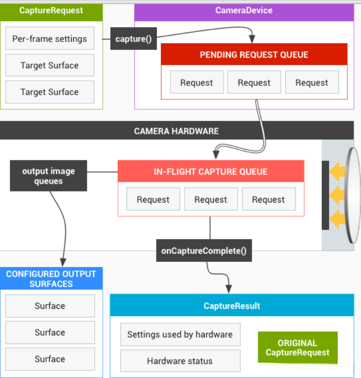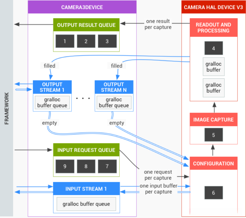 HAL设备必须按照顺序处理请求。对于每个请求,需要生成输出结果元数据以及一个或多个输出图像缓冲区。请求和结果需遵循先来先处理的原则,同时对于后续请求所引用的流,也需遵循此规则。