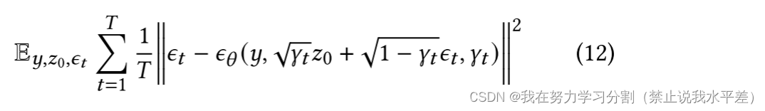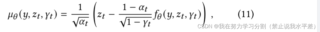 我们利用条件图像 𝑦 形式的额外信息来帮助逆转扩散过程。因此,利用条件图像 y 和噪声目标潜掩码 𝑧𝑡 优化神经去噪模型 f 非常重要。下式中的噪声目标潜像掩码𝑧𝑡 与前向扩散过程不同步骤中噪声潜像掩码的边际分布相一致: