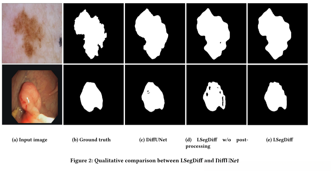 在进行实验时,我们发现所提出的 LSegDiff 的分割预测图经常包含一些小洞。为了解决这个问题,我们对模型的输出进行了后处理,利用直接的闭合形态学操作来填补这些小洞。该技术先将图像扩张,然后侵蚀扩张后的图像,并通过使用核滑过在整个图像中反复使用白色像素值填充空白区域。