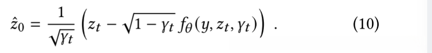 推理过程使用各向同性的高斯条件分布𝑝𝜃 (𝑧𝑡-1|𝑧𝑡, 𝑦),这些分布是从 DDPM 中学习的。通过设置正向过程步骤的噪声方差尽可能小(例如,𝛼1:𝑇 ≈ 1),最佳反向过程 𝑝 (𝑧𝑡-1|𝑧𝑡, 𝑦)将近似高斯。因此,在推理过程中选择高斯条件可以合理地近似于真实的反向过程。值得注意的是,1 - 𝛾𝑇 应该足够大,以确保 𝑧𝑇 遵循近似先验分布,即 𝑝 (𝑧𝑇) = N(𝑧𝑇; 0, 𝑰)。这使得采样过程可以从纯高斯噪声开始。我们注意到,𝑓𝜃 是经过训练的去噪模式,可以在任何噪声图像𝑧𝑡(包括𝑧𝑡)的情况下估计𝜖。因此,在给定𝑧𝑡 的情况下,我们可以通过重排近似地计算𝑧0: