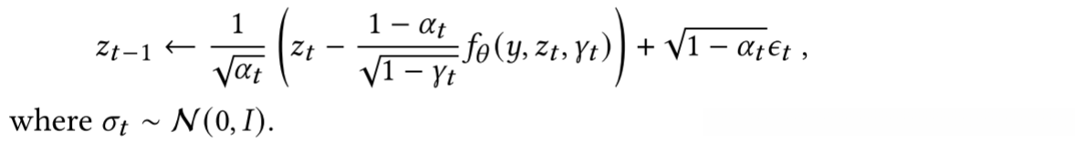 并将𝑝𝜃 (𝑧𝑡-1|𝑧𝑡,𝑦) 的方差设为 (1-𝛼𝑡 ),默认值为正向过程的方差。根据这一参数化,DDPM 模型下反向推理过程的每次迭代形式如下: