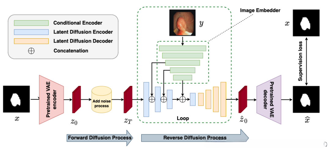 典型的医疗分割数据集由一对输入图像和掩码图像组成,表示为 𝐷 = (𝑦𝑖, 𝑥𝑖 )𝑁 𝑖 。RGB 模式的图像 𝑦𝑖 和二进制模式的掩码图像 𝑥𝑖。这些样本来自未知条件分布𝑝 (𝑥|𝑦),这意味着一对一的映射,即每个输入图像只对应一个掩码图像。我们的目标是通过一个参数模型来逼近𝑝 (𝑥|𝑦),该模型经历了一个随机迭代改进过程,将输入图像𝑦映射到掩码𝑥上。潜在分割扩散模型 LSegDiff 的整体架构如图 1 所示。1.我们的架构由三个主要模块组成: