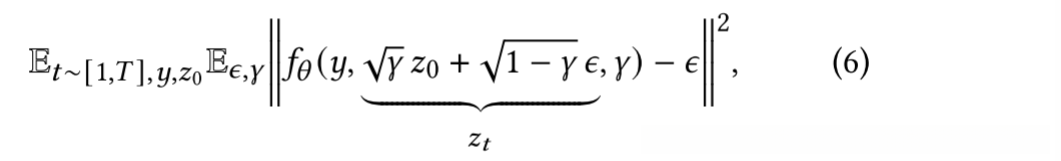 去噪模型 𝑓𝜃 (𝑦, 𝑧𝑡, 𝛾)通过输入源图像 𝑦、噪声目标图像 𝑧𝑡 和噪声方差的充分统计量 𝛾来增强,然后训练它来预测噪声向量 𝜖。通过对标量 𝛾 的调节,去噪模型可以了解噪声的程度。训练 𝑓𝜃 的目标函数为:
