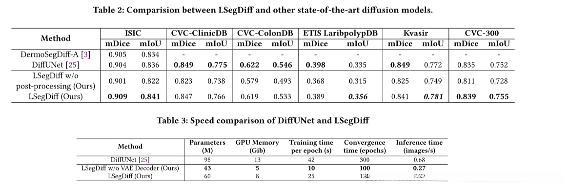 从表3可以看出,我们提出的模型LSegDiff在使用ISIC[5]数据集和Polyps数据集运行时,每个epoch的训练时间和总训练时间都更快,我们模型的推理速度也优于原始模型DiffUNet。