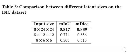 潜在大小对模型性能的影响。在本实验中,我们考察了6 × 6、12 × 12、24 × 24等不同潜值对掩模图像压缩的影响。我们根据Dice和IoU分数对每个配置进行基准测试。从表5中我们观察到,8 × 24 × 24的潜在向量产生的效果最好。