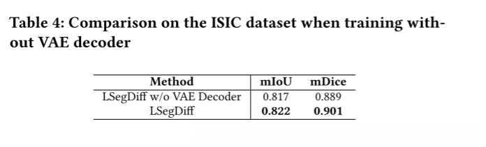 使用均方误差函数,而语义分割任务包含其他损失。我们可以通过将潜在向量转换到图像空间并计算Dice损失来结合MSE损失来改进损失计算。此外,我们实验中使用的息肉和皮肤癌数据集包含一个类,因此s形函数可以用于BCE损失。我们在ISIC数据集上运行这个实验,并比较不同设置下的LSegDiff。