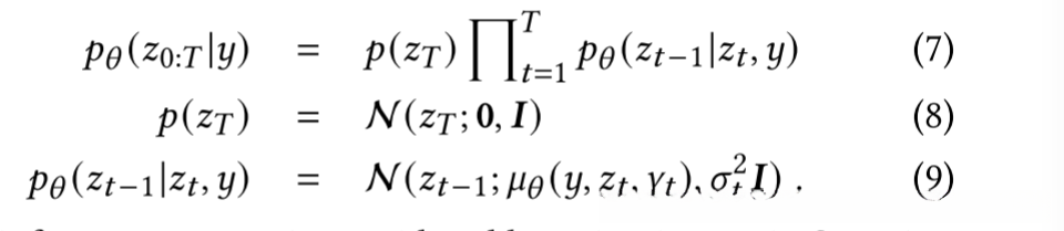 在 DDPM [9]中,推理是通过反向马尔可夫过程进行的,其运行方向与正向扩散过程相反。该过程从高斯噪声𝑧𝑇开始,条件图像𝑦以相反的顺序进行: