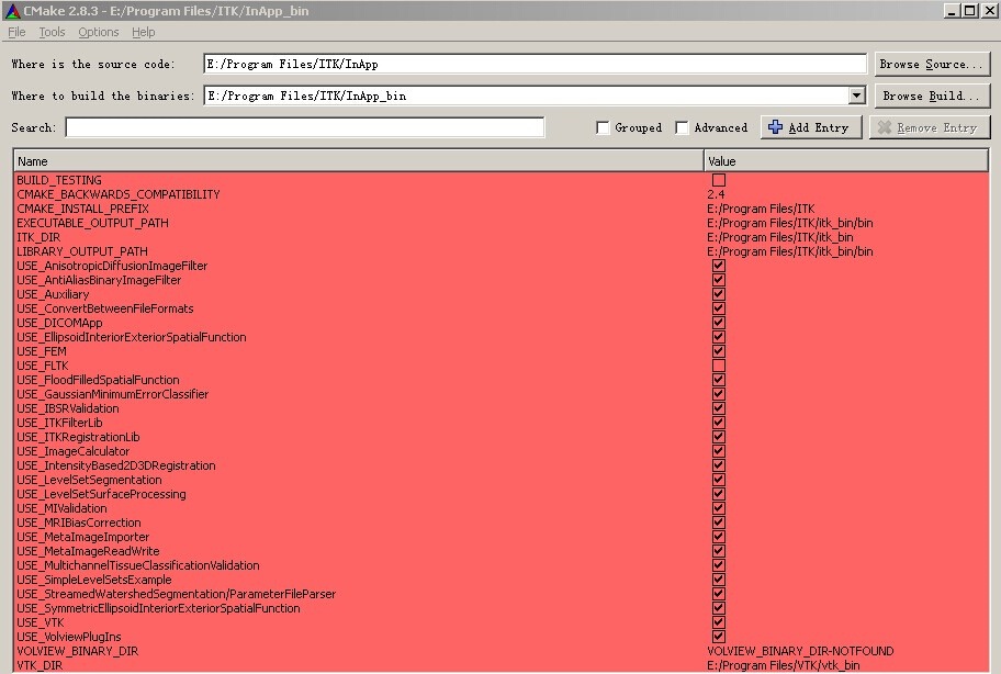 必须选用32位版本,并且应先安装VTK软件库,在高级选项卡中指定名为Module_ITKVtkGlue的部分必须被勾选(以便确保两个库的有效连接)。只有这样做才能与前文所述的VTK实现相连接