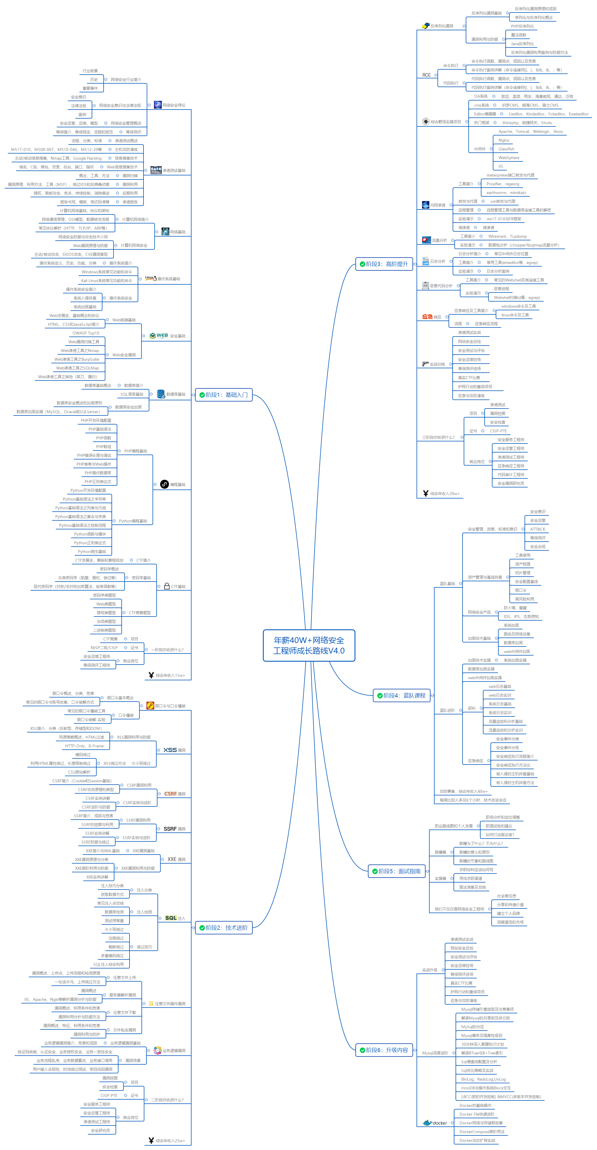 有了这些基础,如果你要深入学习,可以参考下方这个超详细学习路线图,按照这个路线学习,完全够支撑你成为一名优秀的中高级网络安全工程师:
