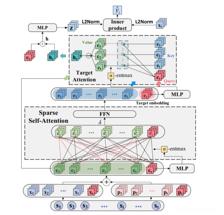 - 引入了一种基于上下文的自适应稀疏注意机制,以发现会话中可能的不相关项目,并为相关项目保留更高的权重。