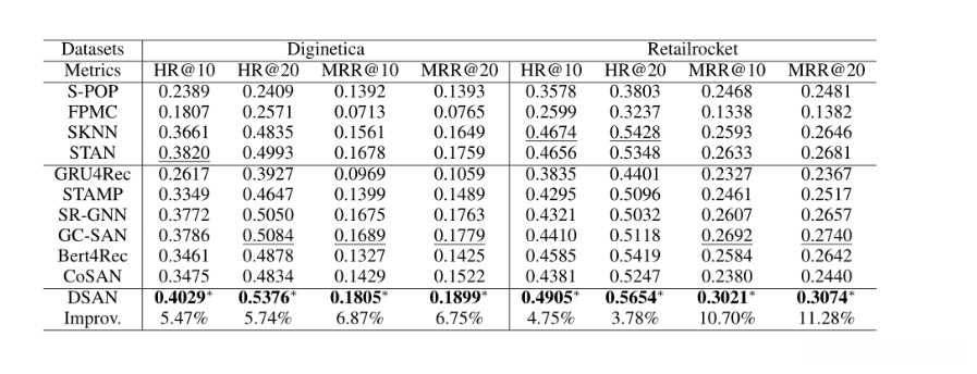- 提出了一种基于由自我注意和普通注意组成的双重注意网络的新框架。它学习与项目级协作信息的目标嵌入,并对高级信息使用不同的查询、关键字和值向量来有效地建模基于会话的推荐场景。