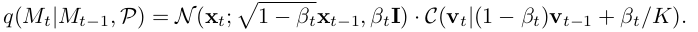 基于最近关于连续分布和离散分布进展的研究 Ho et al.(2020)与 Hoogeboom et al.(2021),我们采用高斯分布在连续位置信息 x 上以及分类分布在元素种类上进行建模以模拟分子系统的概率结构。为此我们需要定义一种能够反映不同元素特性和芳香环属性的新模型框架。具体而言我们假设分子系统的概率分布由各点位置的概率密度函数 f(x) 和各点所属元素类型的条件概率 P(c|x) 综合决定。在这个假设下我们可以将整个系统的概率密度函数表示为 f(x,c) = f(x)P(c|x) 即各点位置独立于其所属元素类型的联合概率密度函数。为了构建这一模型框架我们首先在每个时间步长 t 中对所有类别进行操作并在此基础上对每个类别中的样本分别施加微小高斯噪声和平移操作以模仿扩散过程中的随机扰动机制。随后通过设计一个基于方差参数序列 β₁, β₂, …, β_T 的马尔可夫链逐步构建这一复杂的系统结构
