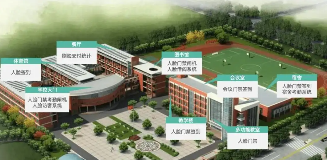 部署实时视频监控系统,在各校区重点区域部署补点式监控设备以覆盖全区域的安全防护水平。在各校区大门出入口、主干道及每栋大楼一层次出入口部署人脸识别摄像头实施布控,并建立 whitelist of permissible individuals for authorized personnel access. 同时将该系统接入公共安全 facial recognition database, 以便快速识别并阻止潜在非法活动.