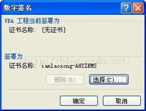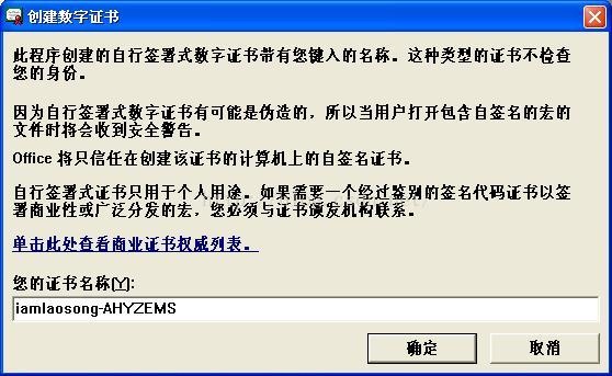 Microsoft Office集成了一个名为"VBA 项目的数字证书"的功能(在开始菜单下的程序选项卡下找到Microsoft Office工具中的VBA 项目的数字证书),单击该菜单项后会打开一个对话框,请您任意指定的一个字符串作为数字证书的名称并点击确定以创建数字证书。完成后即可看到生成的结果如图所示。