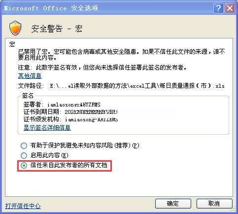 至此之后,在打开该Excel文件或任何使用该数字证书的应用所涉及的Excel文件时将不再显示安全提示信息,并且宏能够正常运行。未来在开发新程序时,只需将该数字证书配置进去即可完成验证过程。