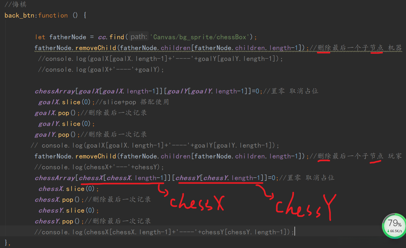 之前的代码均是用chessX、chessY这样类似int类型的变量进行实现,没有存储的功能,因此需要一维数组来记录这些坐标。如果想要悔棋,实际上就是将最近的节点删除并且将坐标从一维数组中删除以及坐标所处的状态(黑棋、白棋)置为空即可。