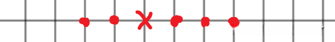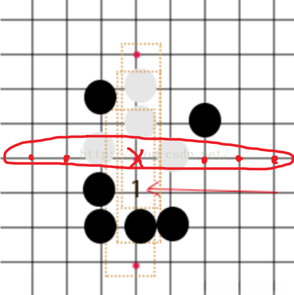 如上图,只看水平方向。假设红点位置均下了白棋,白棋方下一步要在叉号位置下白棋,很明显如果下了这一步,白棋获胜。然而,若上述代码sum的判断条件是=4的话,此时sum=5不满足条件,无法判定获胜,与逻辑违背。因此sum的判断就是>=4。