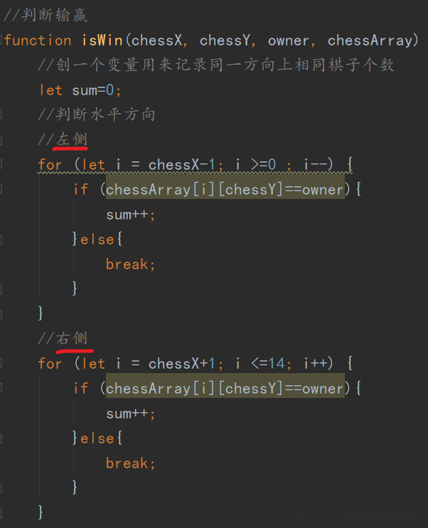 全局函数isWin传递4个参数:chessX(下棋位置x矩阵坐标)、chessY(下棋位置y矩阵坐标)、owner(区分黑棋、白棋、空位置)、chessArray(棋盘二维数组 记录某位置是黑棋还是白棋还是空位置)。这里只需关注“左侧”“右侧”部分的代码实现,对于“左侧”,假设黑棋下棋位置坐标为(3,3),那么我们需要顺序遍历(2,3)(1,3)(0,3)位置,如果(2,3)是黑棋,则sum+1。接着看(1,3),若不是黑棋则退出遍历,看右侧。最后将sum也就是棋数统计判断大于等于4即可,sum置零。继续判断垂直方向(分上、下侧)以及正斜方向(右上侧、左下侧)、反斜方向(左上侧、右下侧),每判断一个大方向后,sum置零。这里剩下3大方向的实现就不给出,请需要的读者根据水平方向自行思考。